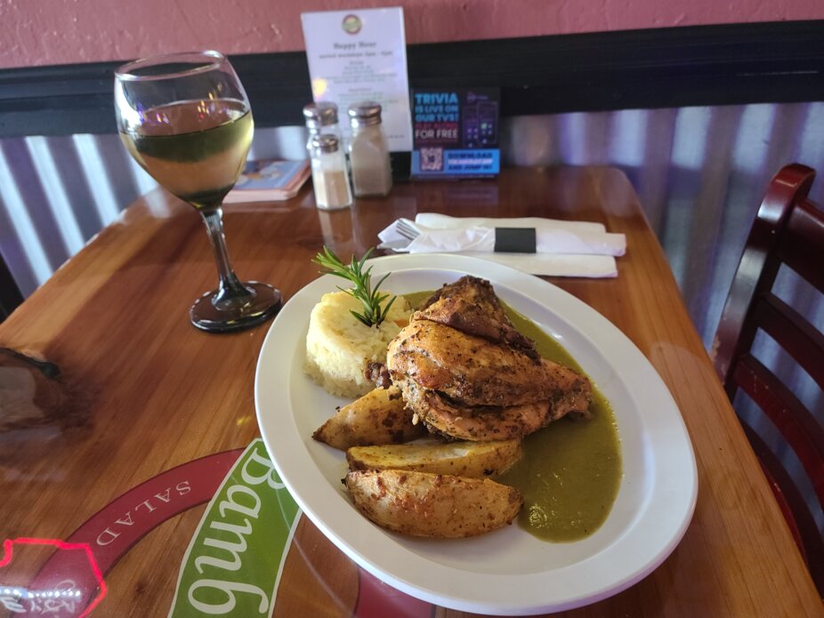 $24.95 - Half Chicken Roasted with Herbs, Papas Bravas White Rice and Poblano Tomatillo Sauce